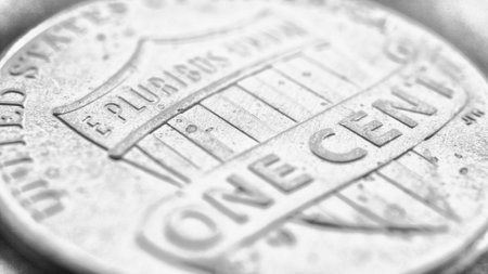 American 1 cent coin very close up. Black and white light background or wallpaper on an economic or financial theme. B&W gray backdrop. USA state benefits and government assistance. Strong macro