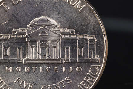 Monticello the primary plantation of Thomas Jefferson the founding father and 3rd president of USA from the reverse side of American money coin of 5 five cents 2016, on old USA dollar series 1935