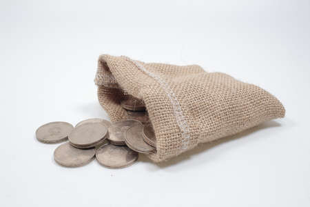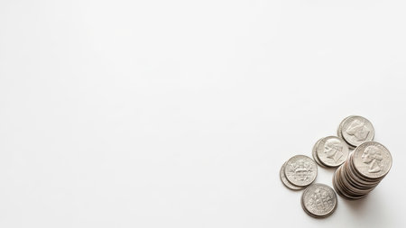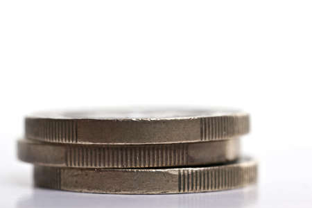 Several stacks of coins arranged in row on white background, symbol of financial savings, growth, investments, and wealth building.