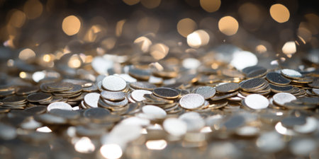 Close up of shiny coin money texture background with pile of American coins everywhere - including nickels, pennies, quarters, and dimes. Shows wealth, power, status through a bunch of scattered cents