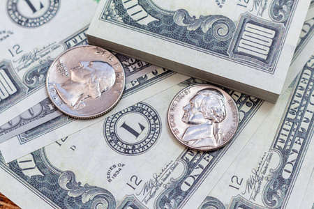 Pack of dollars banknotes and coins background finance economy currency close up selective focus US currency USD