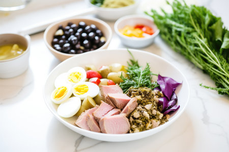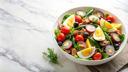A vibrant and healthy tuna salad bowl filled with a variety of fresh ingredients. The bowl includes hard-boiled eggs, green beans, black olives, cherry tomatoes, red onions, and a bed of mixed greens. The tuna is placed centrally, surrounded by colorful vegetables, creating a visually appealing and nutritious meal.