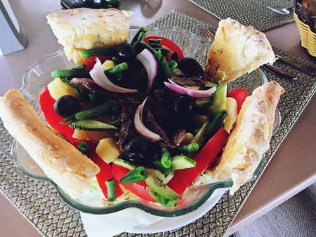 A delicious and healthy vegetable and anchovy salad. Dish served in a restaurant in Urziceni in Romania.