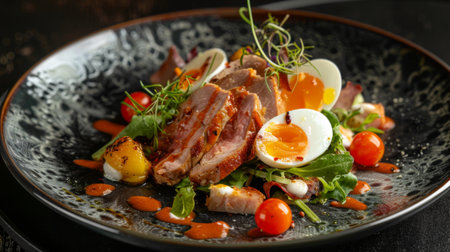 Tasty italian salad of beef tongue with eggs, arugula, tomato, spices and sauce.