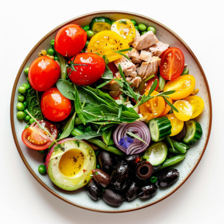 This delicious salad features fresh ingredients like tomatoes, olives, and greens, perfect for a light meal. The dish is beautifully presented, showcasing the colors and textures.