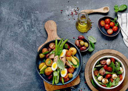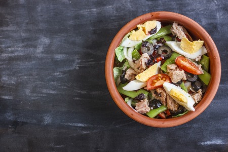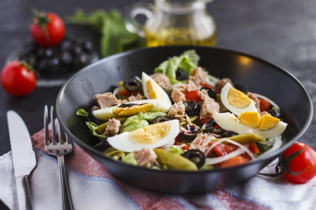 Nicoise salad with tuna, egg, cherry tomatoes and black olives. French cuisine. Top view, copy space