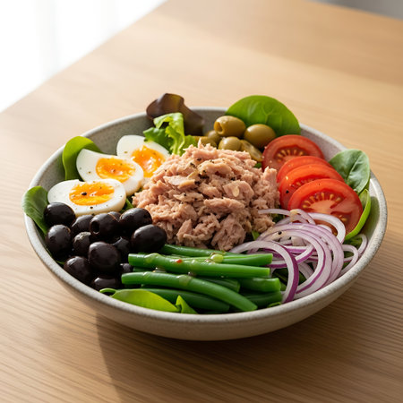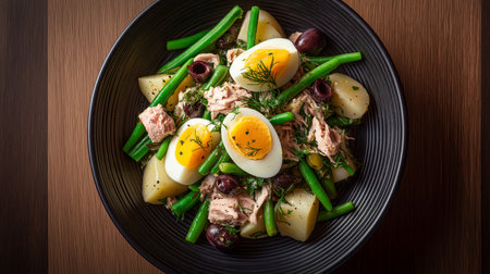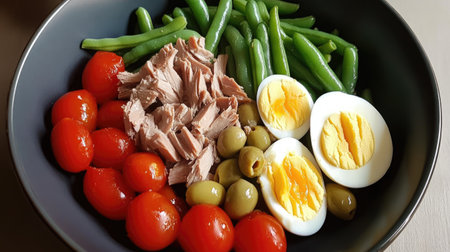A vibrant salad featuring tuna, boiled eggs, green beans, cherry tomatoes, and olives, perfect for a healthy lunch or dinner option. Enjoy the freshness!