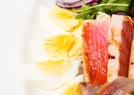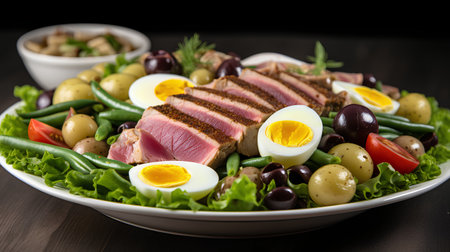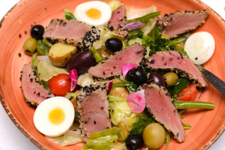 This close up showcases a classic French Nicoise salad, featuring a perfectly cooked tuna steak, fresh vegetables, and olives, a culinary delight.