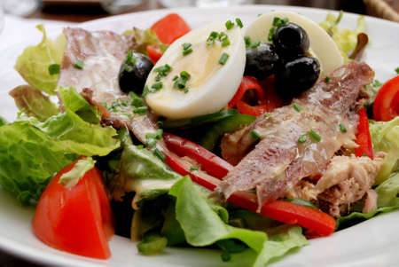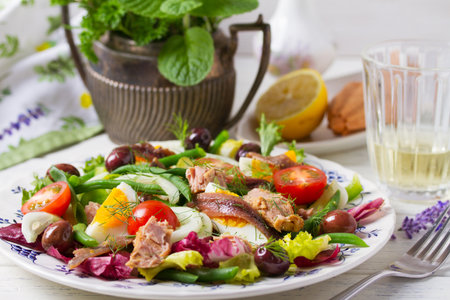 French salad Nicoise with tuna, eggs, green beans, tomatoes, olives, lettuce and anchovies.