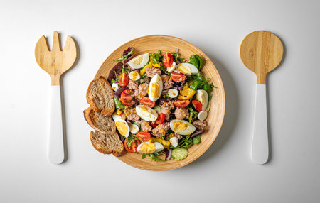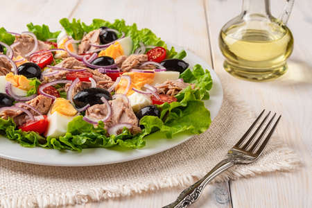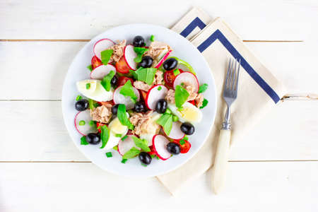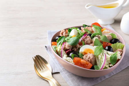 Mediterranean Tuna Salad. Nicoise Salad. White wooden background
