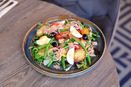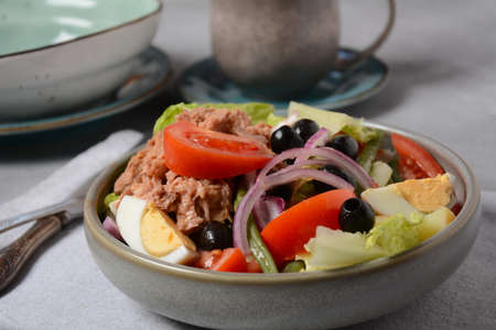 Salad Nicoise. French cuisine. Healthy salad of tuna, green beans, tomatoes, eggs, potatoes, black olives close-up in a bowl on the table.