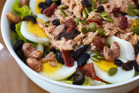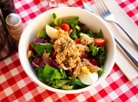 Colorful salad with canned tuna, eggs and cherry tomatoes