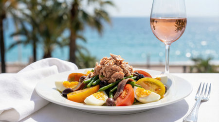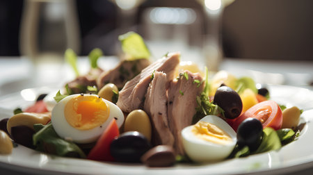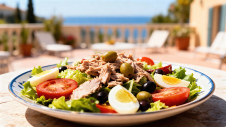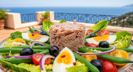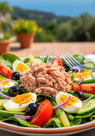 This close up showcases a colorful Nicoise salad, featuring tuna, olives, tomatoes, and eggs, set on a table with a scenic background.
