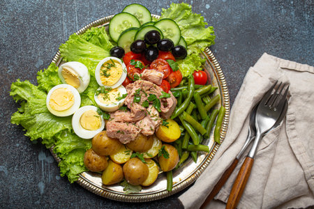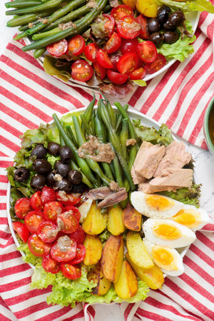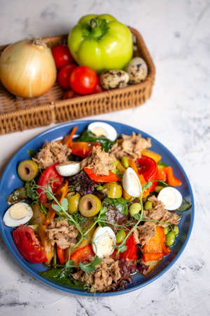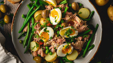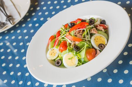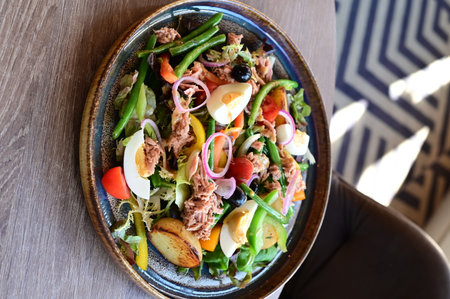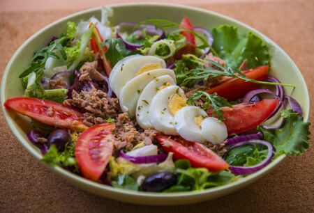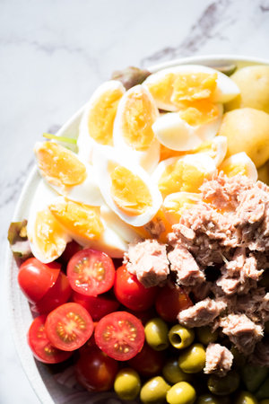 Nicoise salad with vegetables, tuna, eggs and anchovies.style hugge.top veiw.selective focus