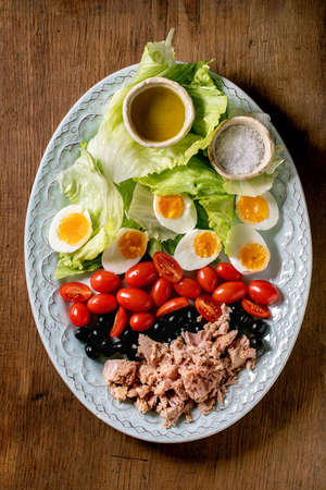 Layered Traditional nicoise salad with canned tuna fish, olives and eggs, served with olive oil dressing and sea salt on ceramic plate over wooden background. Flat lay, copy space
