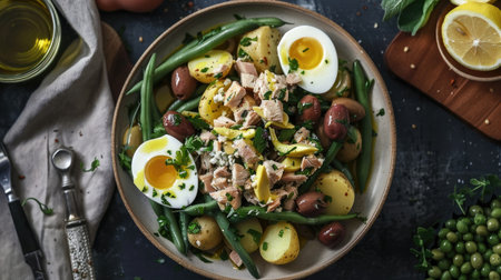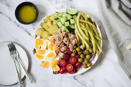 Salad with tuna, green beans, boiled potatoes, cherry tomatoes and olives