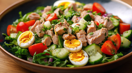 A vibrant salad of tuna, eggs, fresh greens, and vegetables, drizzled with a light dressing, creating a healthy, visually appealing dish perfect for clean eating.