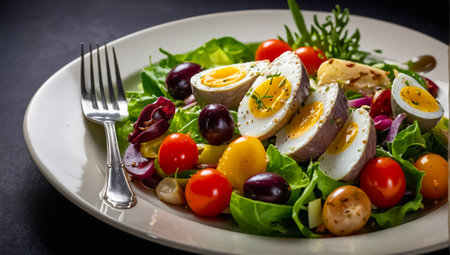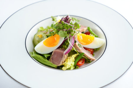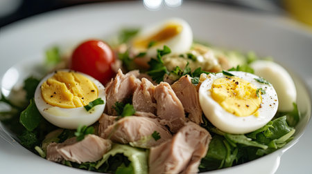 Delicious and healthy salad with fresh greens, tuna, sliced eggs, and vegetables, served on a stylish white plate.