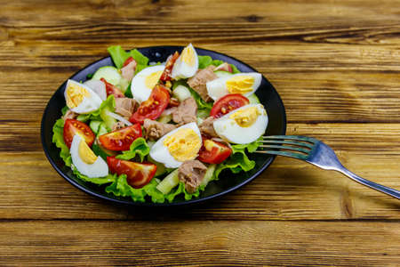 Tasty tuna salad with eggs, lettuce and fresh vegetables on wooden table