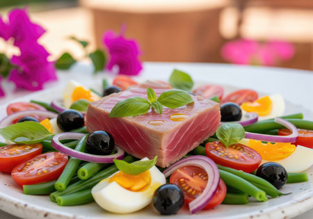 This close up showcases a beautifully arranged French salad featuring a generous portion of tuna, complemented by fresh tomatoes, olives, and green beans, all set against a scenic backdrop.