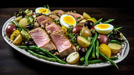 Vibrant and nutritious nicoise salad with seared tuna, greens, eggs, and potatoes