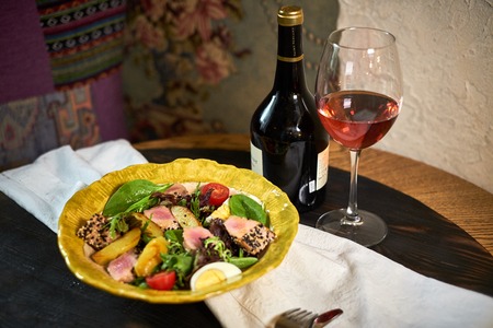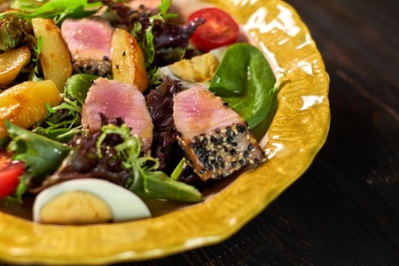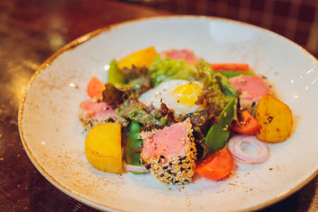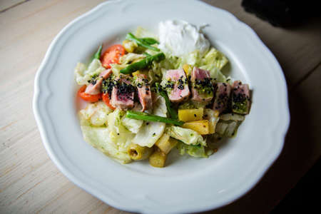fresh seared raw tuna mixed vegetable salad with mustard sauce