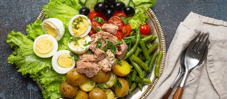 Healthy hearty salad with tuna, green beans, tomatoes, eggs, potatoes and black olives in a plate. Dark background. top view. Copy space.