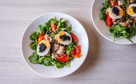 Salad with tuna pieces, boiled egg, cherry tomatoes, lettuce and microgreens