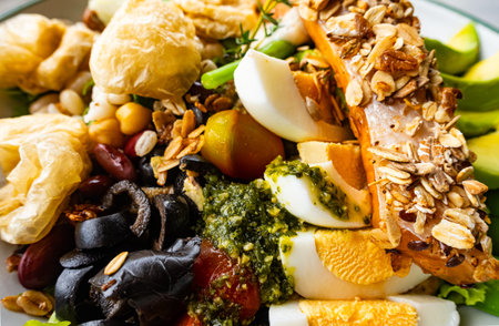 close-up of isolated salad with tomatoes, eggs, fish, tuna, herring, olive, lettuce and sauce