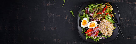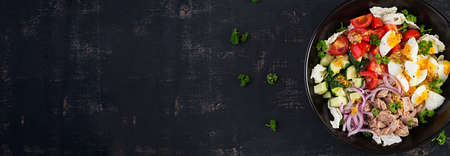 Healthy food. Tuna fish salad with eggs, lettuce, cherry tomatoes, cucumber and red onions. French cuisine. Top view, banner