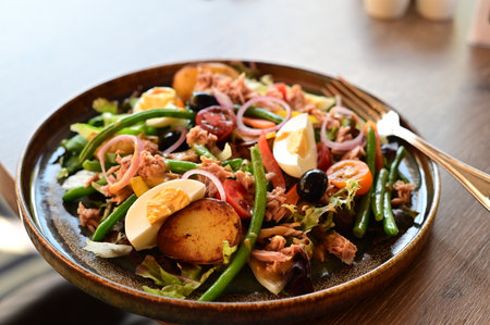 Tuna salad with green beans, eggs and tomatoes on wooden table