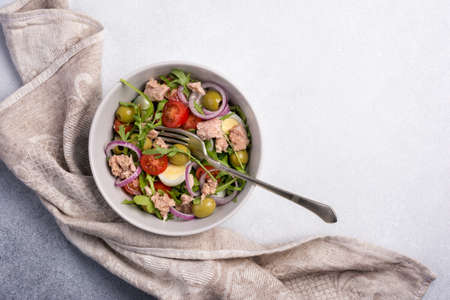 Top view of healthy and tasty salad with tuna fish, fresh arugula, cherry tomatoes, quail egg, onion and green olives on grey concrete background