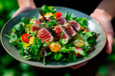 A person holds a plate of seared tuna on a bed of mixed greens, surrounded by colorful cherry tomatoes. The bright sun enhances the freshness of the ingredients.