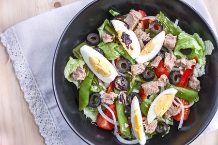 Nicoise salad with tuna, olives, green beans, tomatoes and eggs on a bed of lettuce