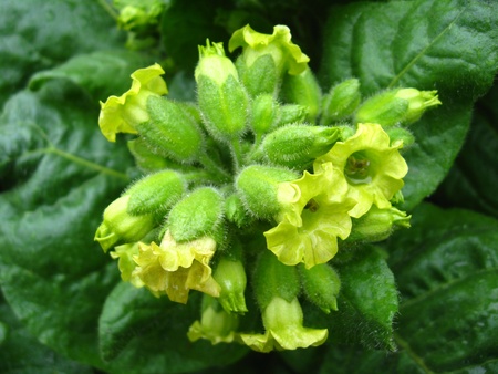 Close up eye level view of little yellow flowers on the nicotiana rustica tobacco plant also known as Sacred Hopi, Turkish or Aztec tobacco. Used in medicinal and spiritual ceremonies.