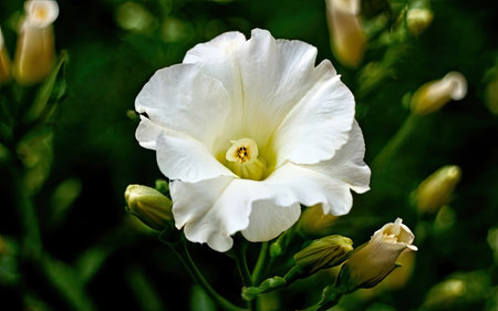 A close up of a white Nicotiana flower also known as the flowering tobacco plant. It is set against an out of focus dark natural background
