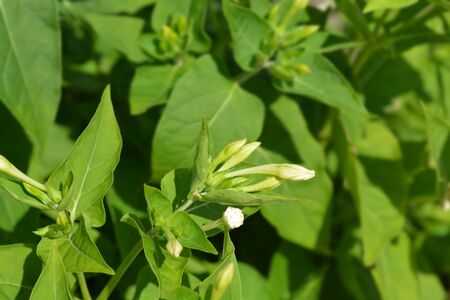 Many delicate white flowers of Nicotiana alata plant, commonly known as jasmine tobacco, sweet tobacco, winged tobacco, tanbaku or Persian tobacco, in a garden in a sunny summer day