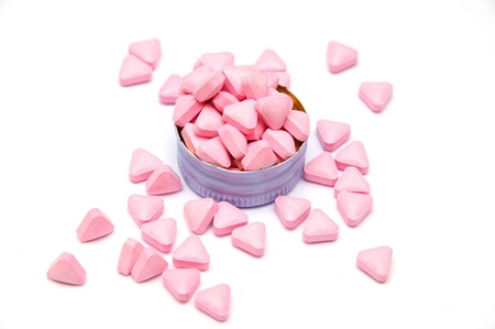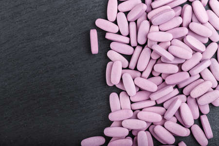 large pink tablets scattered on a black background