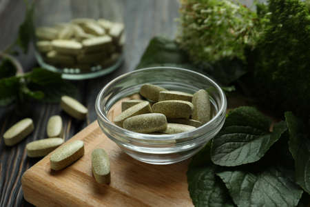 Concept of herbal medicine pills on wooden table, close up