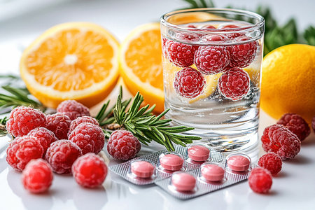 A beautiful shot of fresh fruits, berries with medical pills in a transparent jar