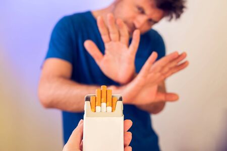 Quitting smoking concept. Hand is refusing cigarette offer. Stop smoking and healtcare concept