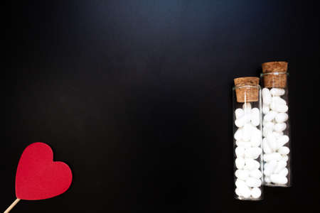 Jordan almonds and heart shape. Wedding decoration on black background. Confetti food