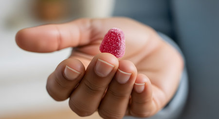 A close-up macro shot of a person's hand holding a single red, sugar-coated gummy. The gummy, likely a vitamin or candy, is held between the thumb and index finger with the palm open.