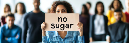 Woman holding no sugar sign with diverse colleagues promoting healthy lifestyle and sugar reduction