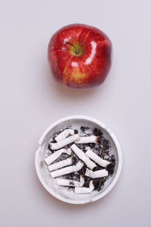 Red apple and ashtray. Say No to Cigarettes, Say Yes to Apple.