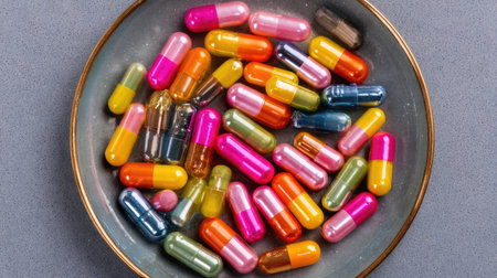 A vibrant collection of colorful capsules is displayed in a round bowl against a soft gray background. Ideal for health and wellness themes.