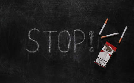 Word STOP! chalk hand drawn on blackboard and a pack of cigarettes. Quitting smoking concept, nicotine addiction