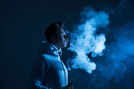 A young guy smokes a vape in the studio in neon light.