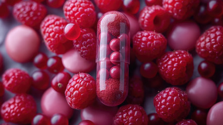 Capsule with red pills and fresh raspberries, closeup