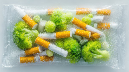 Broccoli and cigarettes sit together in a sealed bag, creating an unexpected mix of health and harm, evoking deep thoughts on lifestyle choices.